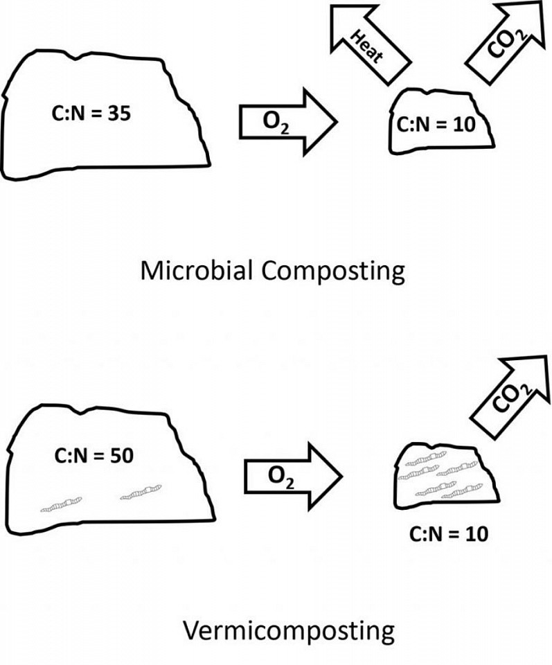 Vermicomposting is similar to traditional composting. Both use natural processes to stabilize organic matter (Figure 1). Traditional composting relies on fungi and microorganisms to stabilize organic matter; therefore, it is sometimes called microbial composting. Worms do most of the composting in vermicomposting. Both microbial and worm composting are aerobic processes – they require oxygen (O2) to function. One advantage of vermicomposting is you do not need to aerate or turn a vermicompost pile. The worms do the turning for you. Excess energy is given off as heat in microbial composting (Figure 1). In vermicomposting, most of this energy is tied up in worm biomass. In fact, the last thing you want is a vermicompost pile to heat up. Composting worms hate heat. If they can, red wigglers will escape from hot compost piles. If they cannot escape, they usually die. Few things smell worse than dead tiger worms.